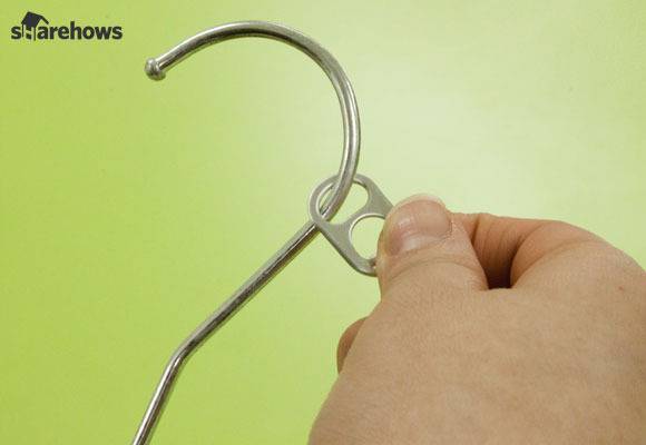 먼저, 캔 뚜껑의 구멍 중 하나에 첫 번째 옷걸이를 걸어줍니다.