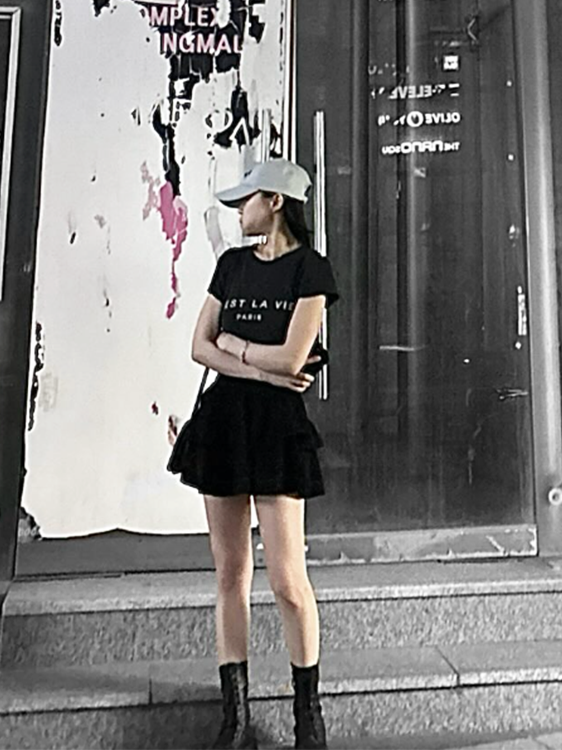블랙 반팔 티셔츠와 미니스커트를 매치하고, 발목 위까지 올라오는 블랙 워커로 힘을 더한 룩은 도심 속에서도 존재감을 발산한다.