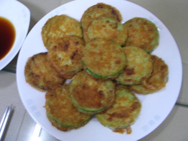 호박을 얇게 썰고, 밀가루를 묻혀 달걀물에 적신 뒤