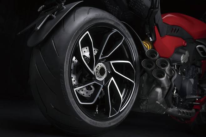 디아벨 시리즈의 핵심은 240mm리어타이어에 있다. 이 존재감 넘치는 거대한 타이어는 디아벨 시리즈만을 위해 피렐리에서 제작한 것으로 디아블로 로쏘2로 처음 만들어졌고 로쏘 3로 진화했다. 드래그 머신의 분위기를 풍기면서도 코너에서 뒤뚱거리기 바빴던 기존의 와이드타이어와는 달리 날렵하게 코너를 돌아나갈 수 있도록 타이어 프로파일을 뾰족하게 설정했다. 애초에 이 타이어가 있었기에 지금의 디아벨이 탄생할 수 있었던 것이다. 덕분에 디아벨 시리즈는 240mm타이어를 장착하고도 꽤나 날렵한 코너링 성능을 보여줬다. 여기에 2세대로 진화하며 한 단계 자연스러운 코너링 성능을 보여줬다. 하지만 어디까지나 240mm타이어를 감안하고 봤을 때의 성능이었다.