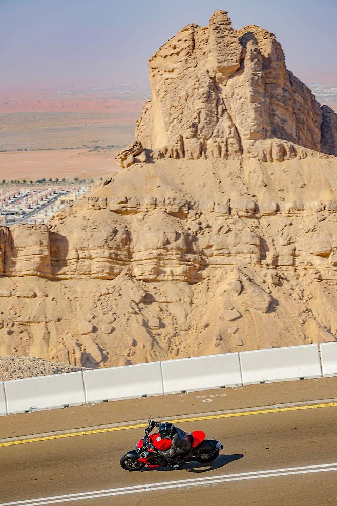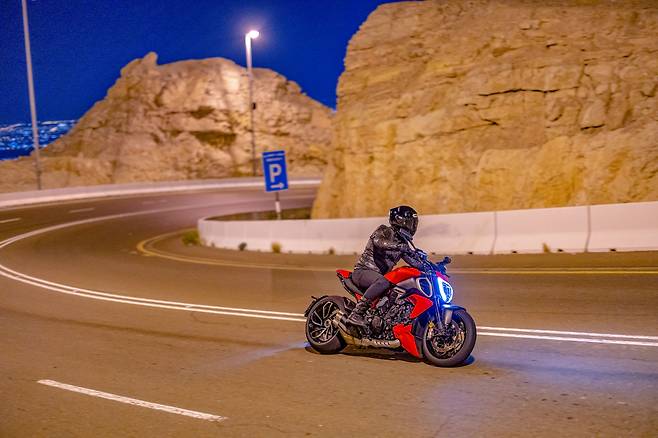 이번 디아벨V4의 성능을 오롯이 테스트하기 위해 선택된 무대는 아랍에미리트연합UAE 두바이에 도착해서 차량으로 두 시간 이상 달려서 도착한 자벨하핏이다. 드넓은 사막한가운데 이상하리만큼 높게 솟아있는 자벨하핏은 정상까지 연결되는 도로로 유명하다. 디아벨 V4는 콘셉트 자체가 트랙보다는 도로가 어울리는 바이크지만 제 성능을 테스트해보기 위해서는 일반 도로에서는 한계가 명확했다. 그래서 두카티는 자벨하핏의 도로를 경찰의 협조로 완전히 통제한 뒤 미디어 테스트를 진행했다. 덕분에 도로 테스트였지만 트랙테스트 같은 느낌으로 진행되었다. 총 길이 11.7km에 해발 1200m까지 오르는 고저 차, 그리고 매끈한 노면에 속도제한도 없으니 디아벨V4에겐 최적의 테스트 장소였다. 테스트는 이틀에 걸쳐 진행되었으며 낮에도, 밤에도 달렸다. 특히 인근의 도시인 알아인 야경을 내려다보며 달린 야간 라이딩은 그야말로 환상적인 경험이었다.