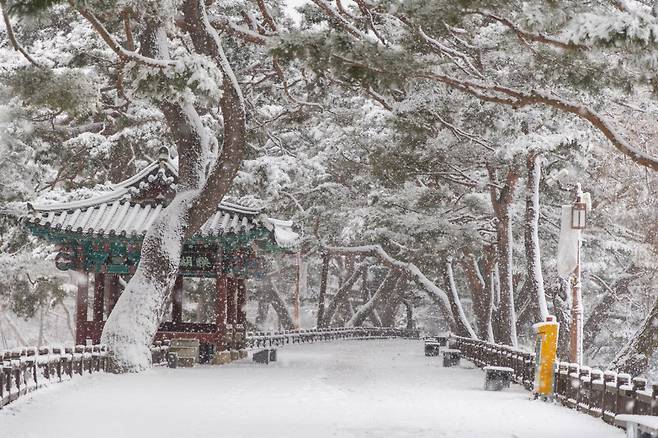 제림 둑 위에 늘어선 노송들도 겨울이 되면 또 다른 얼굴을 보여줍니다. 사계절 내내 푸르던 소나무 위로 눈이 내려앉으면, 마치 세월의 무게를 고스란히 품은 듯한 모습이 됩니다. 한겨울에도 꺾이지 않는 소나무의 기상은, 의병의 고장 제천의 분위기와도 자연스럽게 닮아 있습니다.