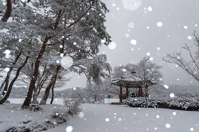 호수 동쪽으로 시선을 옮기면 우륵정 이 모습을 드러냅니다. 우륵이 가야금을 연주했다는 전설이 전해지는 우륵대 인근에 세워진 정자로, 눈이 쌓인 모습은 한 폭의 동양화 같습니다. 정자 아래로는 물가가, 뒤편으로는 나지막한 숲이 이어져 겨울 풍경을 담아내기에 더없이 좋은 자리입니다.