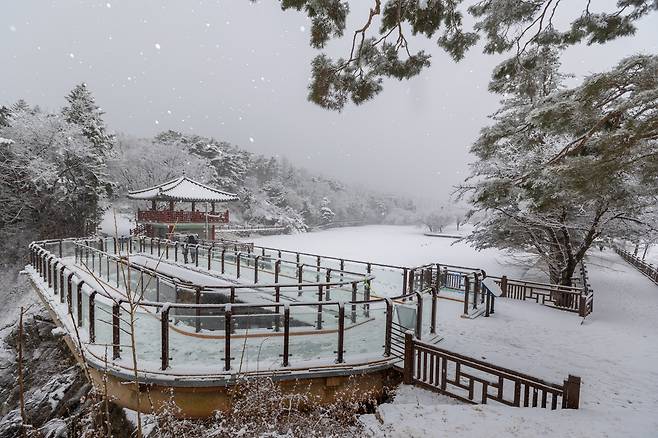 최근 의림지의 새로운 명소로 자리 잡은 용추폭포 와 유리 전망대 역시 눈길을 끕니다. 겨울철에는 안전을 위해 출입이 제한되기도 하지만, 눈 덮인 폭포와 주변 풍경만으로도 충분히 인상적인 장면을 만들어냅니다. 폭포 옆에 자리한 경호루 역시 의림지의 겨울 풍경에 단정한 마침표를 찍어줍니다.