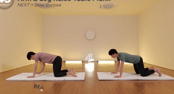 암&레그레이즈 테이블 플랭크는 양팔 자극 및 코어 근육 강화에 효과적인 운동입니다. 운동을 하며 코어 근육에 긴장을 유지해 주세요. 양 팔을 펴고 무릎은 구부린 채로 엎드린 다음, 한 팔과 반대편 다리를 동신에 들어 올리는 동작을 반복해 주세요.