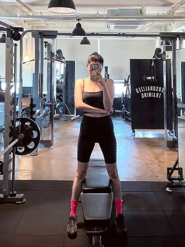 크롭 한 화이트 티셔츠에 하이웨이스트 레깅스를 매치해 심플하면서도 섹시한 무드를 연출했으며, 또 다른 컷에서는 톤온톤 블루의 슬리브리스 탑과 레깅스로 조화로운 애슬레저룩을 완성, 스포츠 양말과 운동화를 더해 실용성까지 챙긴 스타일링을 선보였습니다.