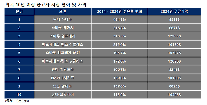 미국 온라인 자동차 리서치 회사 아이씨카(iSeeCars)가 2014년 1월부터 2024년 6월까지 거래된 1억 6900만대의 중고차를 분석한 결과에 따르면 미국에서 10년 이상 된 중고차 판매가 급격히 증가하고 있다. 30%나 증가했을 정도다.
