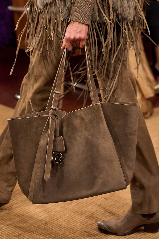 앞서 말한대로, 웨스턴 무드와 보호시크가 트렌드로 부상하면서 스웨이드 백 역시 덩달아 눈에 띄기 시작했죠. 랄프로렌 컬렉션에서는 하나의 스웨이드 백으로 클래식한 웨스턴 룩과 보헤미안 룩을 선보였죠.