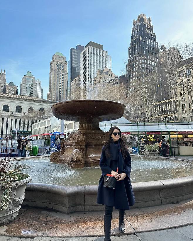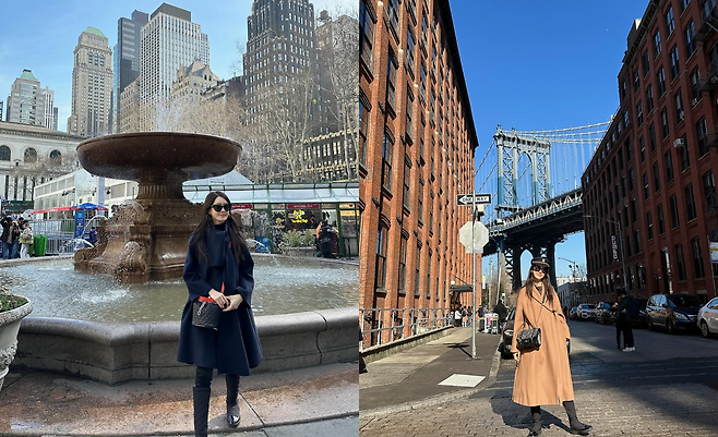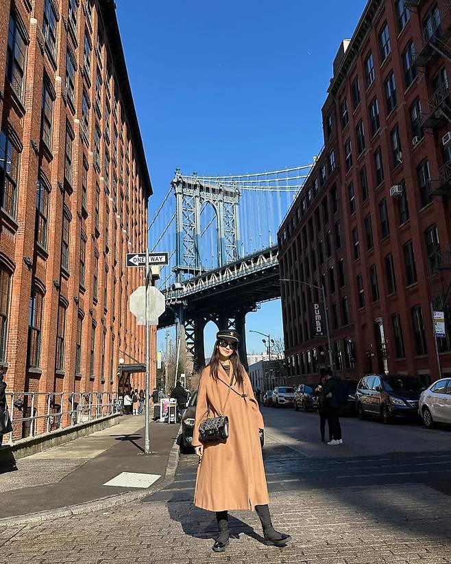 이요원은 클래식한 캐멀 롱코트에 블랙 팬츠와 부츠, 그리고 체인백을 매치해 고급스러운 겨울 스트리트룩을 완성했다. 베이커보이 캡과 선글라스로 스타일에 포인트를 더하며, 뉴욕의 랜드마크와 조화를 이루는 세련된 도시 패션을 선보이고 있다