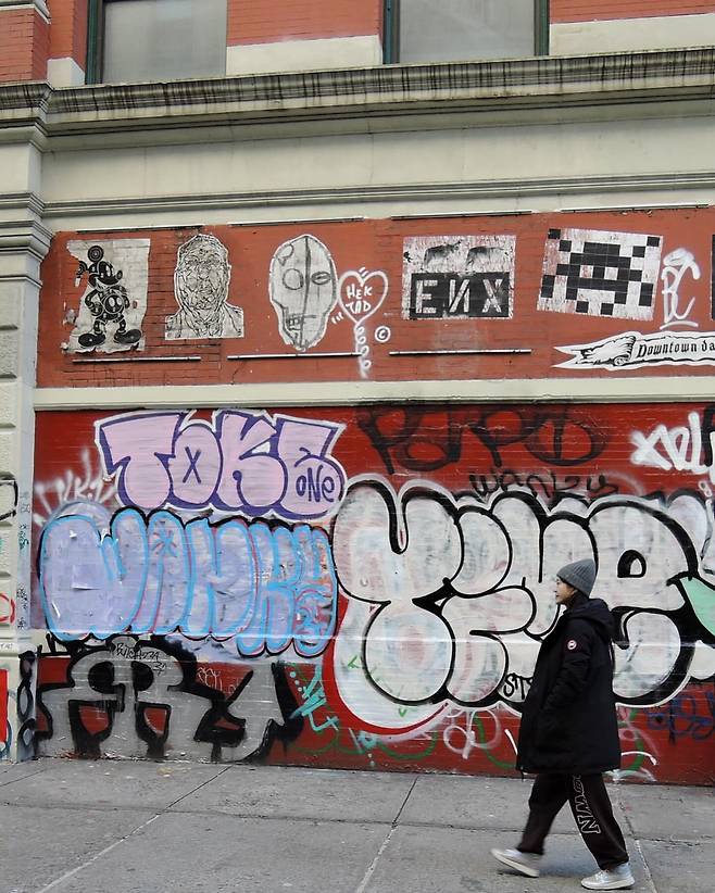 이요원은 블랙 롱패딩과 조거팬츠, 그레이 비니, 그리고 화이트 스니커즈로 편안하면서도 트렌디한 스트리트룩을 연출했다. 자유분방한 그래피티 벽과 어우러지는 캐주얼한 무드가 돋보이며, 실용성과 스타일을 모두 잡은 일상 패션을 보여주고 있다