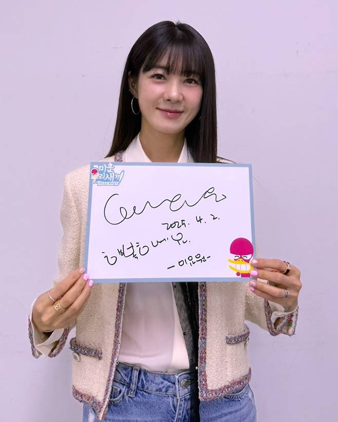 이요원은 깔끔한 화이트 셔츠에 트위드 소재의 크림색 재킷을 매치해 단정하면서도 고급스러운 이미지를 연출하고 있다. 여기에 연청 데님 팬츠로 자연스러운 캐주얼 감성을 더했으며, 골드 링 귀걸이와 심플한 반지 등 미니멀한 액세서리로 포인트를 살렸다. 전체적으로 밝고 부드러운 컬러 조합이 그녀의 단아한 매력을 한층 배가시킨다