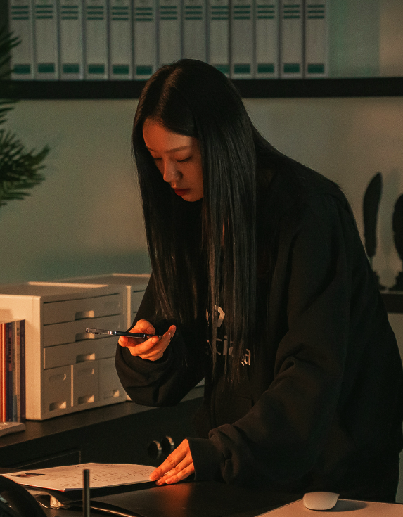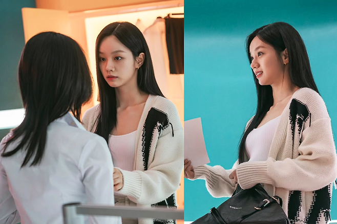 극 중 중요한 장면에서 착용한 블랙 가디건은 오프화이트의 ‘맥시 로고 가디건’으로, 세련된 디자인과 여유로운 핏이 돋보인다.