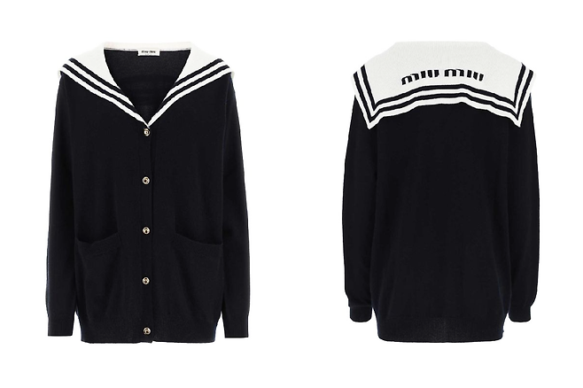 그녀가 착용한 세일러 가디건은 미우미우의 ‘세일러 카라 캐시미어 가디건’으로, 클래식한 디자인에 부드러운 소재가 돋보이는 제품이다.