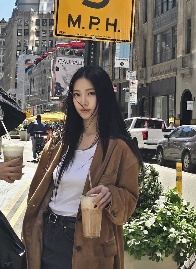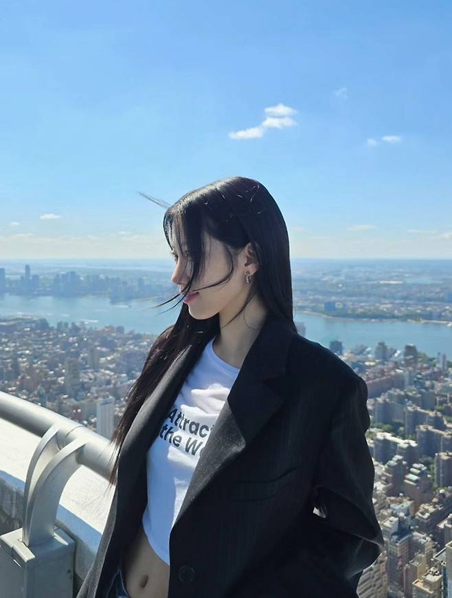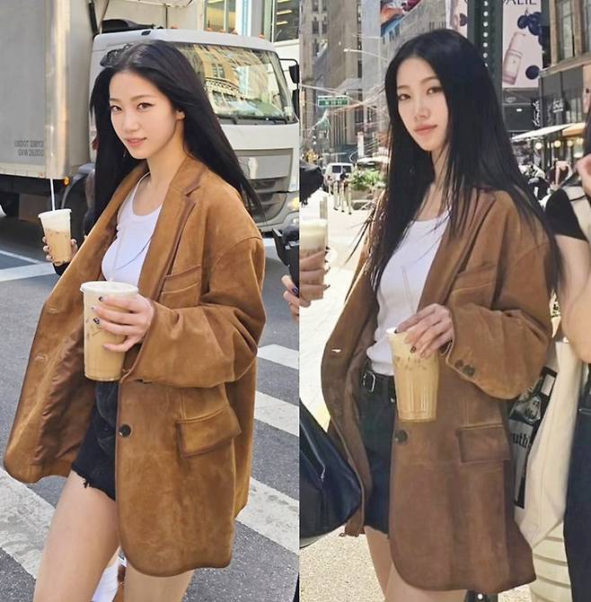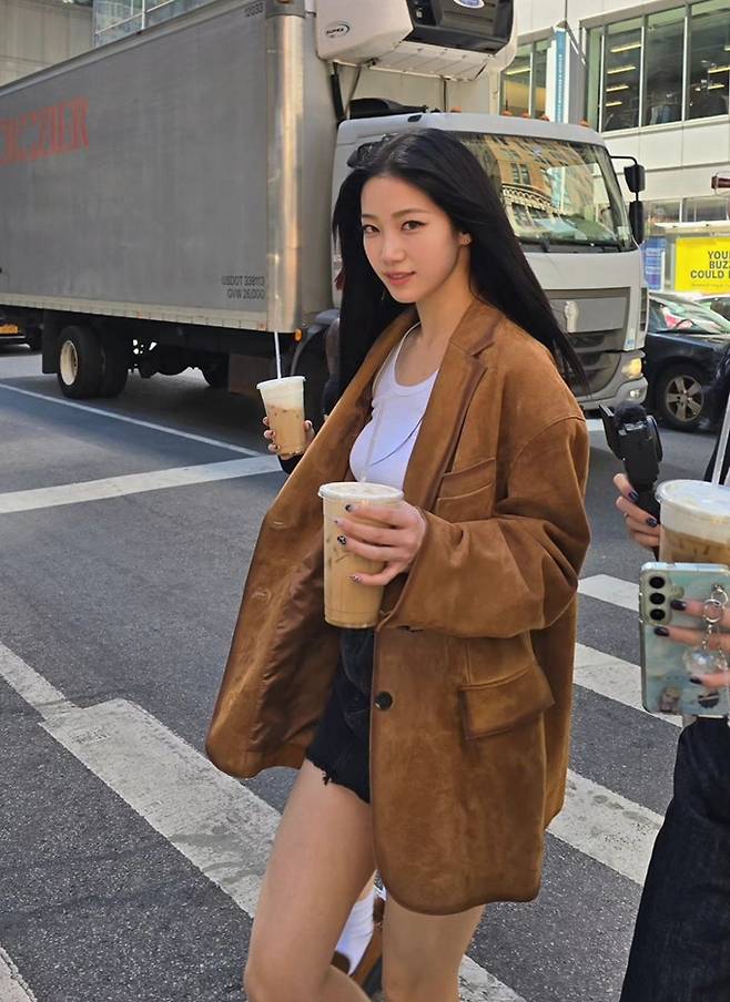 그룹 르세라핌의 멤머 카즈하가 쇼츠에 블레이저 재킷을 걸친 가을 스트릿룩으로 뉴요커의 분위기를 한껏 드러냈다.