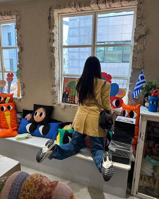 두 번째 컷에서는 벤치 위에 앉아 장난기 가득한 포즈를 취한 채리나의 뒷모습이 눈에 띈다. 블랙 크로스백과 두툼한 러닝화로 편안하면서도 실용적인 데이룩을 완성했으며, 그녀가 앉아 있는 공간의 인형 쿠션과 그래픽 소품들은 전체 분위기에 발랄한 생기를 더하고 있다.