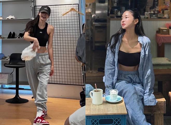 김윤지는 청바지에 화이트탑을 입고 심플한 룩을 완성하는가 하면, 블랙 쇼츠에 크롭톱을 입고 헤어밴드로 포인트를 준 시원한 여름 패션을 연출하기도 했다.