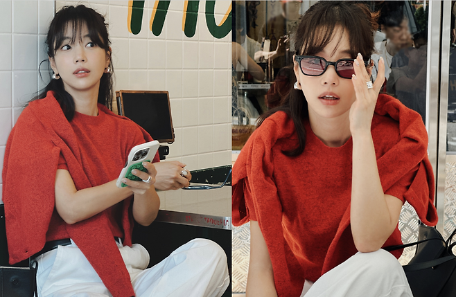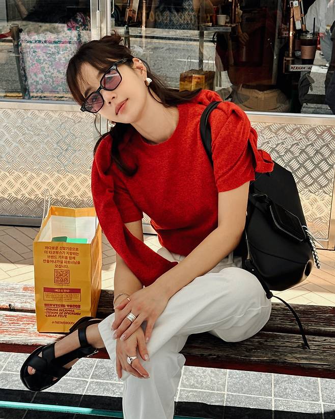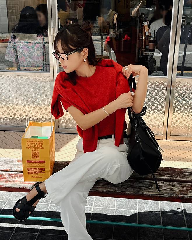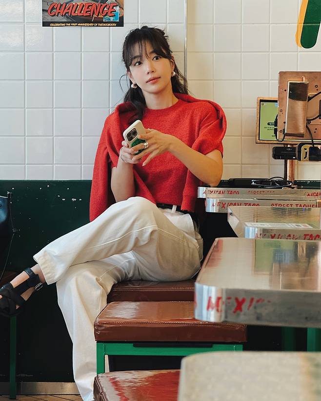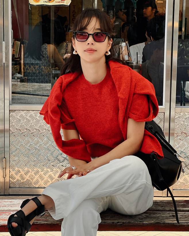 사진 속 기은세는 화이트진에 빨간 반팔니트와 가디건을 매치했습니다.