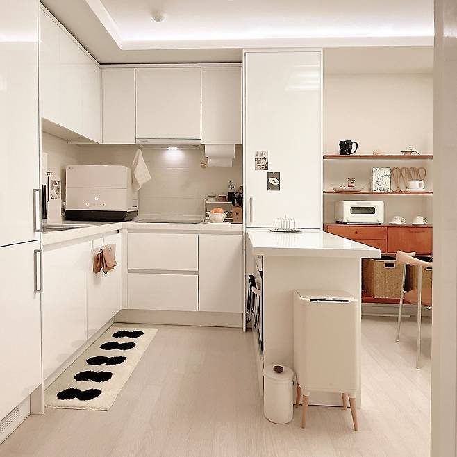 입주 전 주방은 냉장고를 수납장처럼 깔끔하게 숨긴 ᄀ 자 형태의 주방이었어요. 보기에 깔끔하긴 했지만 실생활에서 사용하기엔 소형 주방 가전을 둘 공간이 애매하고, 주방과 거실이 이어져 있어 공간 분리가 안된다는 점이 아쉬웠습니다. 그래서 저는 이곳에 아일랜드 장을 배치해 주방과 거실 공간을 분리하고, ᄃ 자 형태의 대면형 주방을 만들었어요.