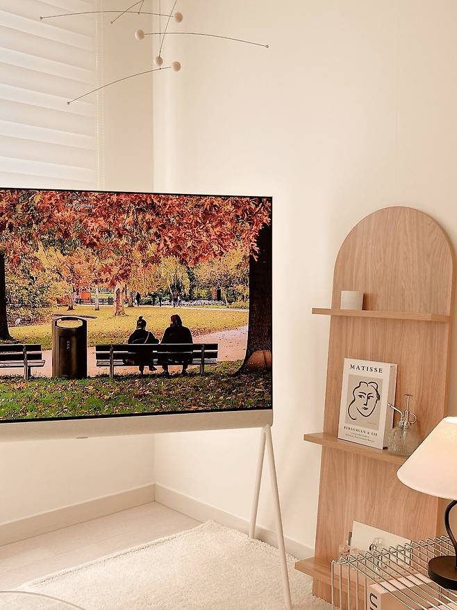 거실에서 소파가 있는 공간은 주로 퇴근을 하고 난 이후, 스탠드 조명만 켜고 남편과 함께 영화나 시리즈물을 정주행할 때 머물러요. 이곳에도 팁이 있는데, 좁은 집의 가구를 고를 높이, 투명도, 색감을 신경 쓰면 공간이 훨씬 넓어 보인다는 거예요. 예를 들어 저는 가로 폭 대비 높이가 낮은 소파를 선택했는데요. 이렇게 하면 소파 다리가 없고 등받이가 낮아 차지하는 면적에 비해 공간이 막혀 보이지 않아서 좋더라고요.