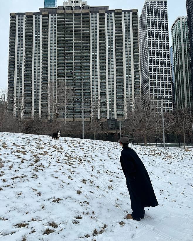눈 덮인 풍경 속, 블랙 롱 코트 하나만으로 무드를 완성한 그녀의 스타일은 단순하지만 깊이 있었죠.