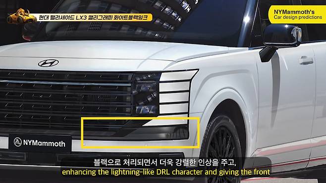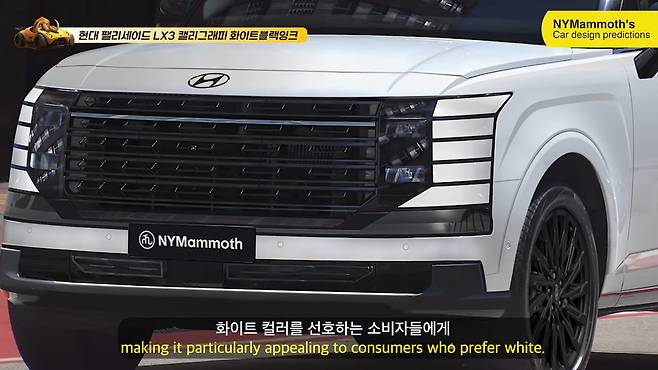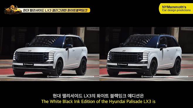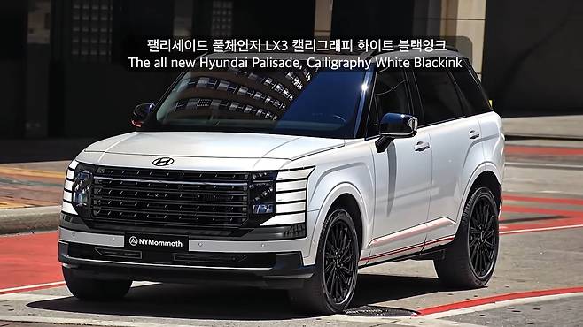 현대 팰리세이드 풀체인지 모델의 화이트 블랙잉크 모델의 예상도가 뉴욕맘모스에 의해 최초로 공개됐다. 화이트바디와 블랙 디테일의 완벽한 조합을 통해 새로워진 모습을 확인할 수 있었다.