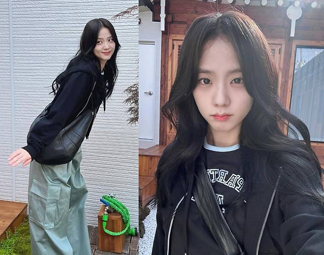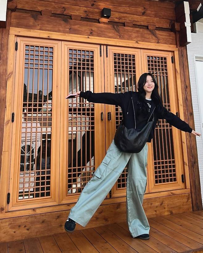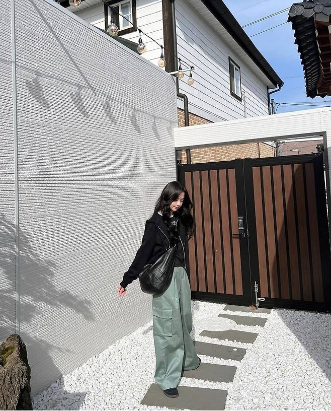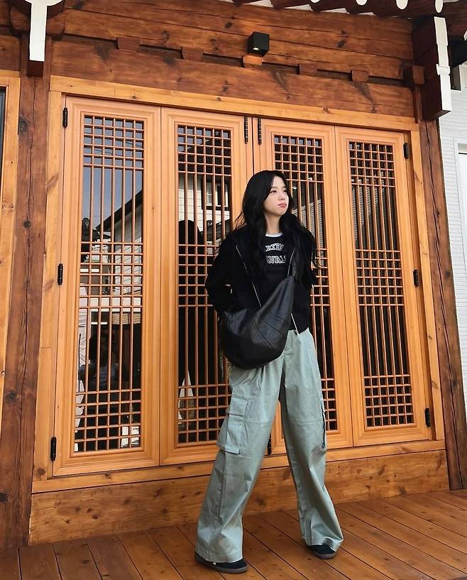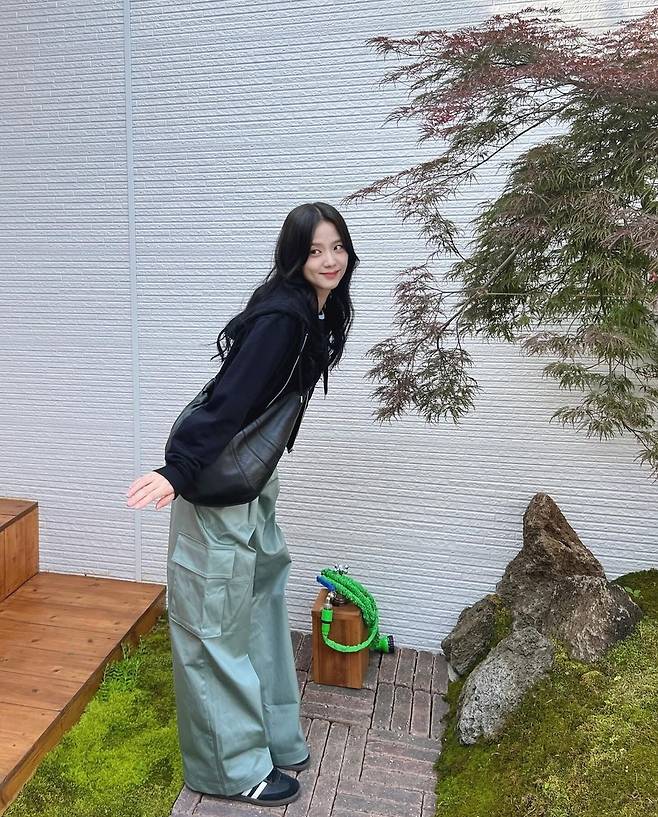 또, 지수는 연한 민트색의 와이드 핏 카고 팬츠를 매치해 유니크한 데일리룩을 완성했습니다.