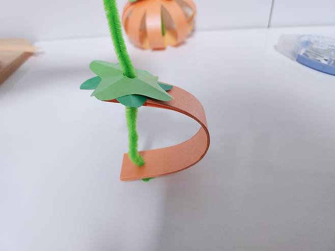옆에서 봤을 때 감 모양 같긴 했지만 공간이 너무 넓어서 원형처럼 보이지 않더라구요. 저는 그래서 모루를 풀고 다시 색종이를 추가해주었답니다.