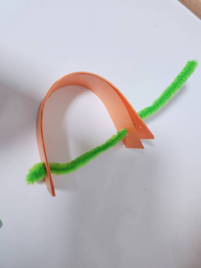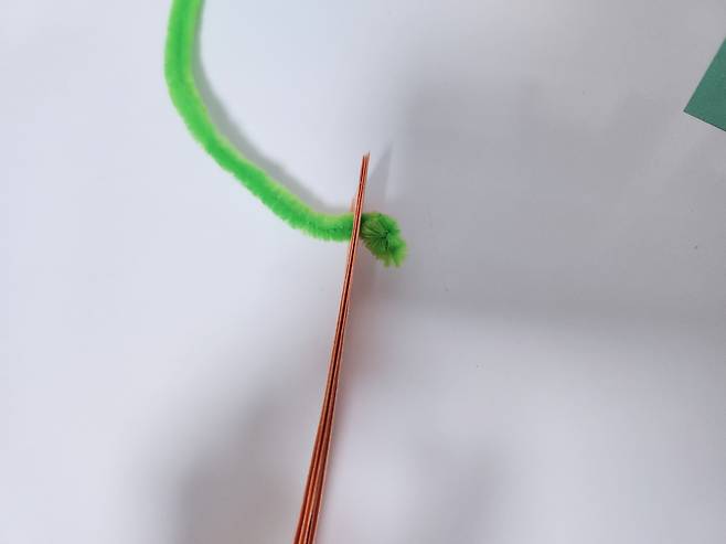 그리고 초록색 모루를 15cm정도 잘라 한쪽 구멍에 끼우고, 모루 끝을 작게 굴려 구멍에 빠지지 않게 만들어주세요.