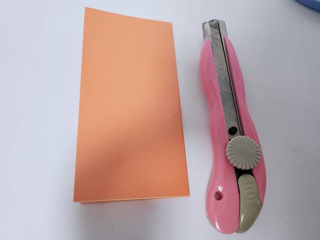두장 겹쳐 붙인 색종이를 반 접고 칼로 잘라주세요.
