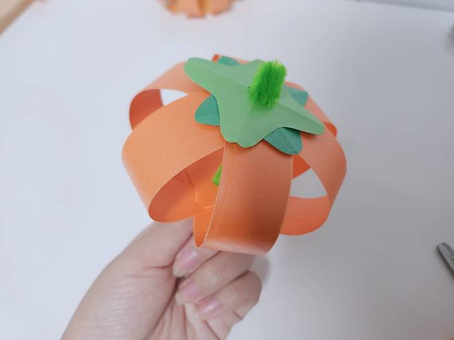 옆에서 봤을 때 감 모양 같긴 했지만 공간이 너무 넓어서 원형처럼 보이지 않더라구요. 저는 그래서 모루를 풀고 다시 색종이를 추가해주었답니다.