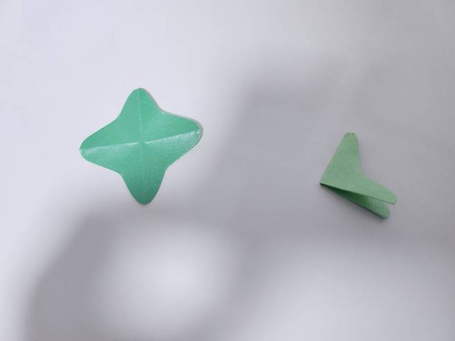 그리고 다시 초록색 색종이를 사진처럼 접어 감 잎을 만들어 주세요.