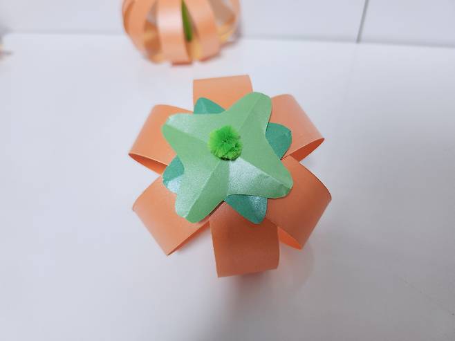옆에서 봤을 때 감 모양 같긴 했지만 공간이 너무 넓어서 원형처럼 보이지 않더라구요. 저는 그래서 모루를 풀고 다시 색종이를 추가해주었답니다.