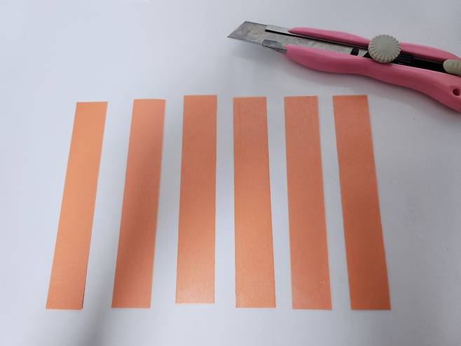 반 자른 색종이를 다시 한번 더 칼로 3등분 해주었답니다. 저는 처음에 6개만 만들었는데 최소 9개정도는 있어야 예쁜것 같아요.