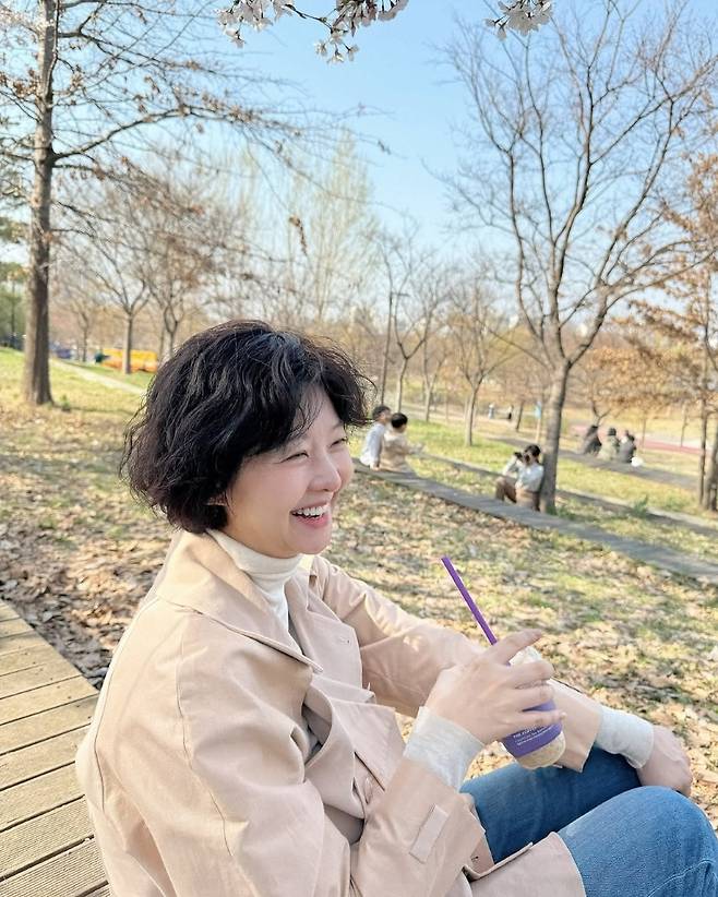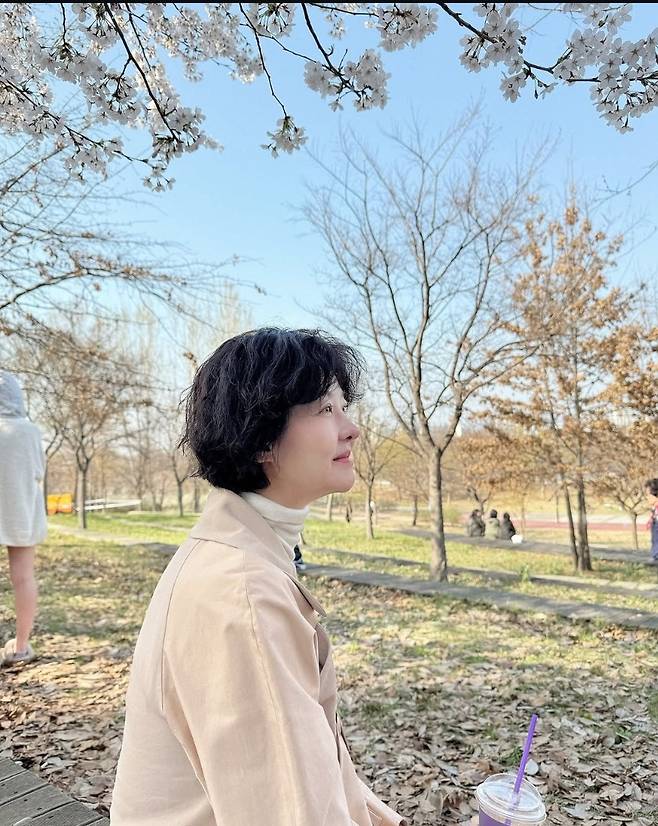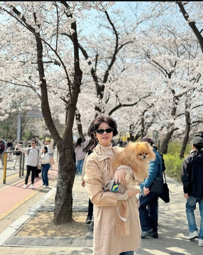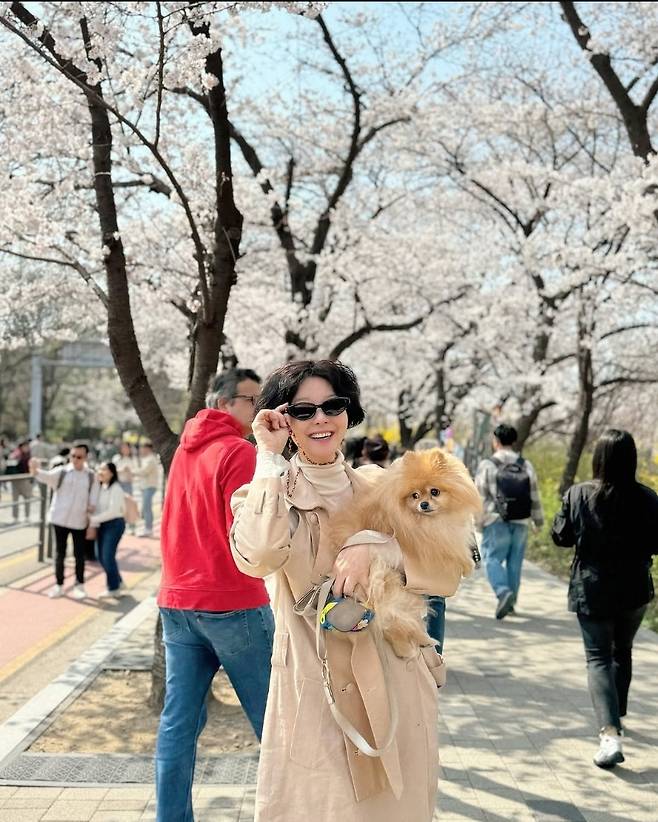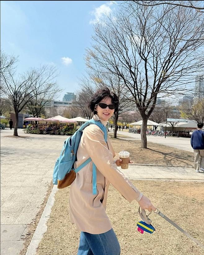 송선미는 서울 도심 속 공원에서 반려견과 함께 산책을 즐기며 봄의 정취를 만끽했습니다.