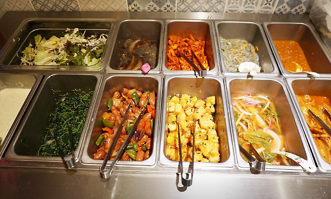 ▶ 얼갈이김치, 고사리, 멸치볶음, 잡채, 도라지무침 등 집밥 느낌 가득한 반찬이 채워져 있고, 부족하면 바로바로 리필되는 편이라 만족도가 높습니다.