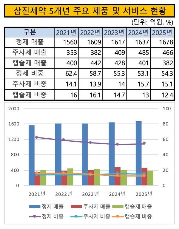 문제는 삼진제약의 매출 대부분이 제네릭에서 발생한다는 점이다. 삼진제약은 지난해 매출의 54.3%가 플래리스·게보린 등 항혈전·소염진통제 중심의 정제 제품에서 발생했다. 주사제(15.1%)·캡슐제(12.4%)를 포함하면 전문의약품(ETC) 매출이 전체의 80%를 넘는다. 반면 건강기능식품 등 상품매출 비중은 11.8% 수준에 그치고 원료의약품 매출은 5%에 불과했다.