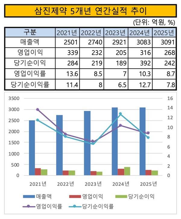 17일 금융감독원 전자공시시스템에 따르면 삼진제약은 2025년 연결기준 실적으로 매출 3091억원, 영업이익 268억원, 당기순이익 242억원을 거뒀다. 에프엔가이드 컨센서스에 비해서도 모두 상회한 수치다. 2024년 매출 3083억원, 영업이익 316억원, 당기순이익 392억원과 비교하면 각각 매출은 0.3% 올랐고 영업이익과 당기순이익은 각각 15.2%, 38.3% 축소했다.