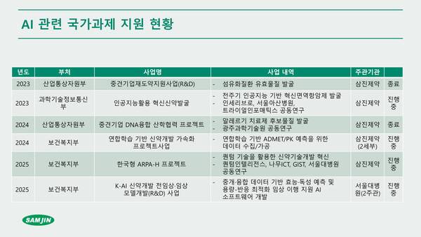 장기적 체질개선 핵심으로서는 AI에 대한 시장의 기대가 크다. 삼진제약은 제네릭 의존을 줄이고 신약개발의 비중을 높이기 위해 2024년 AI신약개발팀을 신설했다. 2023년까지 신약 AI모델 개발을 맡던 디지털이노베이션TF를 정식 팀으로 승격한 것이다. 지난해 11월부터는 371억원 규모 복지부 '2025 K-AI 신약개발 전임상·임상 모델개발' 국책과제에 참여를 시작했다.