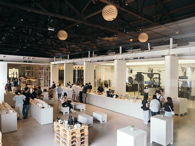 모모스 로스터리&커피바는 공장 겸 카페예요. 500평 공간에 생산 시설이 400평, 손님이 이용하는 홀이 100평을 차지하죠.