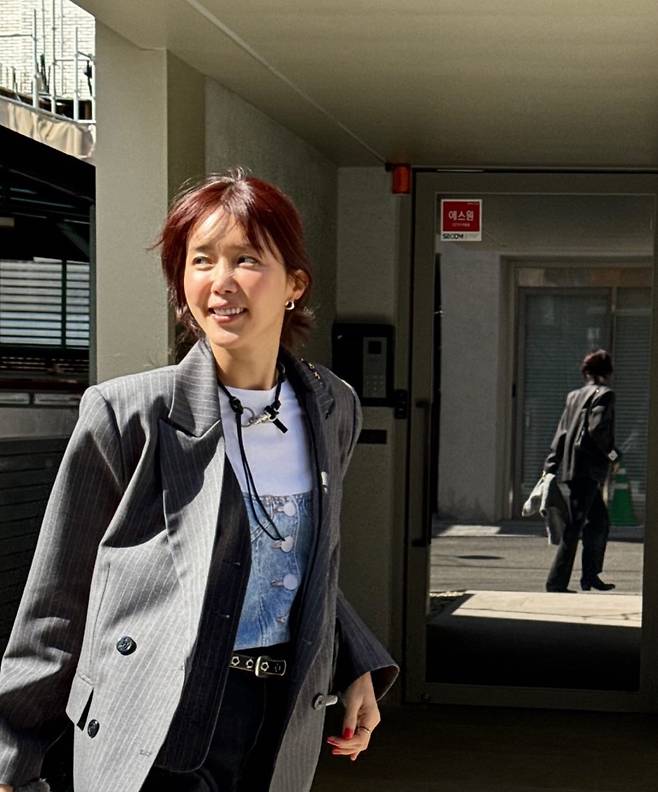 채정안의 헤어 컬러는 레드 브라운으로 최근 염색을 해준 모습입니다. 이런 헤어 컬러는 햇빛에 비쳤을 때 더욱 빛나고 따뜻한 느낌을 주며, 피부 톤을 환하게 만들어줄 수 있는 효과가 있습니다. 자연스러운 햇살 아래에서 이 컬러는 더욱 생동감 있고 광택이 나는 것처럼 보입니다.