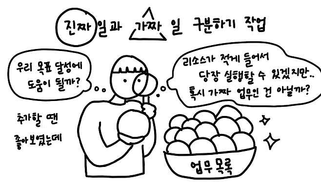 우선순위를 정해볼까요? 라는 질문을 처음 던졌을 때 팀원들의 반응이 아직도 떠올라요. 뭐부터 하면 좋을까요? 기준이 뭔가요? 이거 진짜 해보고 싶었는데 먼저 하면 안될까요? 등 혼란 그 자체였죠. 우선순위를 설정하는 기준 자체도 중요하지만, 앞뒤로 우리가 무엇을 어떻게 고려해야 하는지를 깨달았던 순간이기도 했어요. 가짜 일과 진짜 일의 구분은 우선순위 설정에 앞서 우리가 중요하게 생각해야할 문화이자 단계라고 생각하는데요.