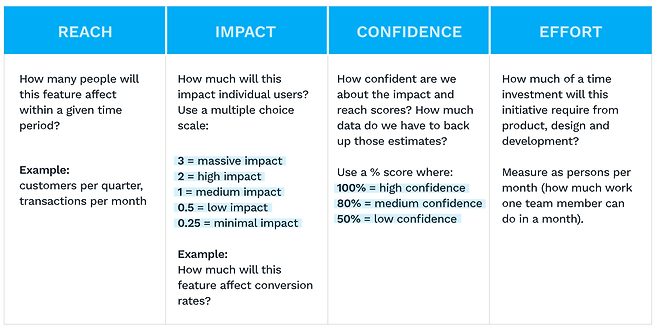 RICE 모델은 제품 관리자가 네 가지 요소에 점수를 매겨 출시할 주요 기능, 제품 등을 결정하는 데 도움이 되도록 설계되었습니다.