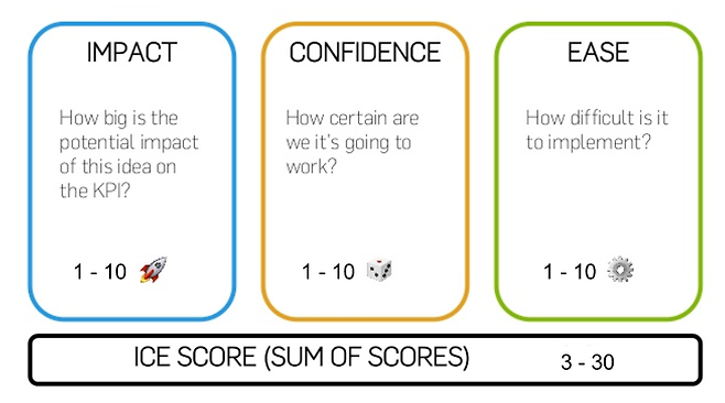 그로스 해킹의 아버지, 드롭박스의 그로스 해킹으로 유명한 ‘Sean Ellis’가 사용하는 의사 결정 프레임워크. ICE의 I는 Impact, C는 Confidence, Esms Ease를 뜻하며 이를 조금더 자세히 살펴보면 아래와 같습니다.