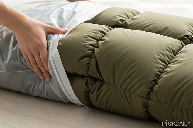 압축팩에 넣는 건 패딩에 가장 나쁜 보관법입니다. 당장은 공간을 많이 절약할 수 있어서 편해 보이지만, 오리털이나 구스다운은 한번 눌리면 복원력이 크게 떨어집니다. 압축팩에서 꺼낸 뒤 아무리 털어도 예전처럼 빵빵해지지 않는 이유가 바로 이거예요.