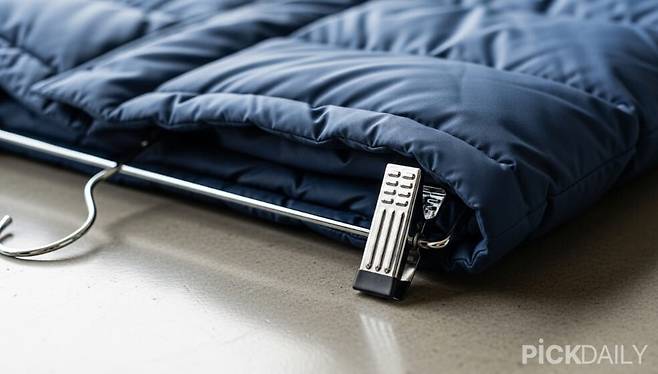 롱패딩이라면 접어서 보관하는 것보다 걸어두는 게 솜 뭉침을 막는 데 훨씬 좋습니다. 어깨 부분은 평소처럼 옷걸이에 걸고, 처지는 하단 부분은 바지 집게 옷걸이로 잡아서 위로 올려줍니다.