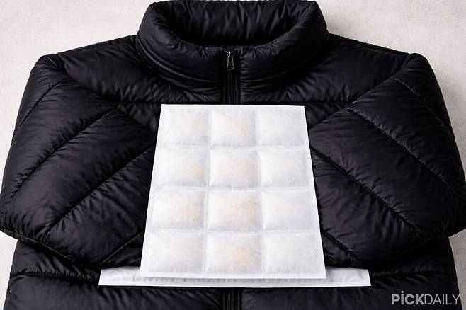 공간이 부족해서 걸어두기 어렵다면 접어서 보관하는 방법도 있어요. 이때 핵심은 제습제와 접는 순서입니다. 패딩을 평평하게 펼쳐두고 가슴 중앙 부분에 제습제를 하나 올려두세요. 장기 보관 중 습기를 잡아주는 역할을 합니다.