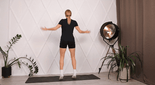 발을 모으고 서서 양팔을 몸 옆에 붙입니다. 점프하면서 다리를 넓게 벌리고, 동시에 팔을 머리 위로 올립니다. 다시 점프하며 다리를 모으고, 팔을 원래 위치로 내립니다. 이 동작을 빠르게 반복합니다.