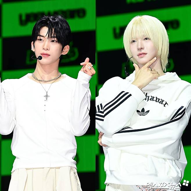 이날 쇼케이스에 참석한 아이덴티티 김도훈, 이청명이 포토타임을 갖고 있다.