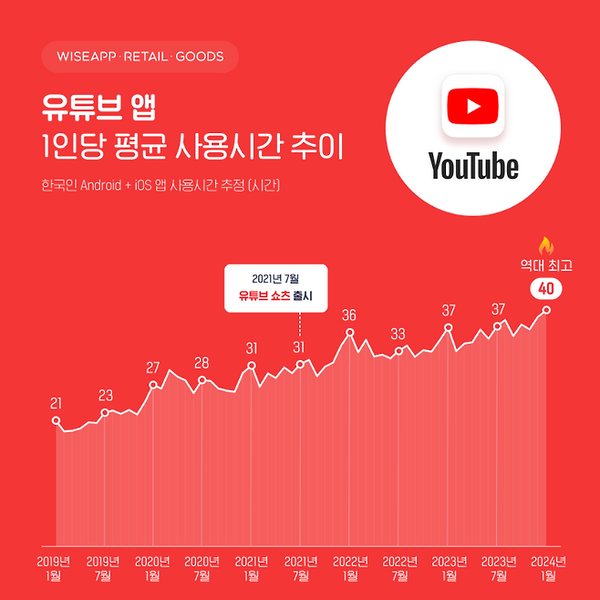 유튜브 앱의 월평균 사용 시간은