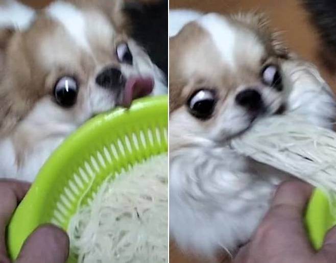 녀석은 옆에 있는 다른 치와와 강아지 오토코는 신경 쓰지도 않고 국수 한 뭉치를 입에 물고 신나게 먹기 시작했죠.